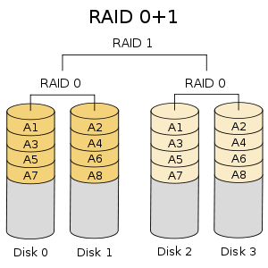 RAID 10 可以被称为1 + 0或0 +1。它将做镜像+条带两个工作。在 RAID 10 中首先做镜像然后做条带。在 RAID 01 上首先做条带,然后做镜像。RAID 10 比 01 好。