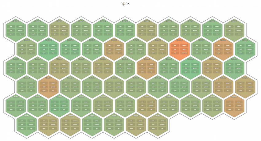你也可以使用 Datadog 的主机地图在更高层面监控你的 NGINX 实例,举个例子,用颜色标示你所有的 NGINX 主机的 CPU 使用率来辨别潜在热点。