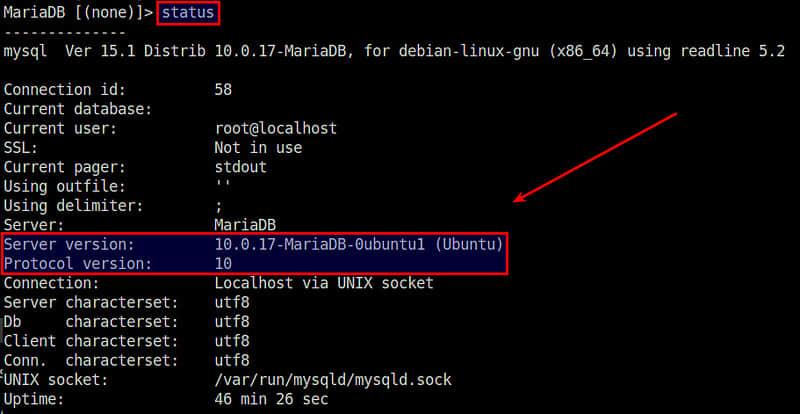 另一种方法是在登录MariaDB后出现的命令行中输入‘status’命令。输出会显示服务器的版本还有协议版本。