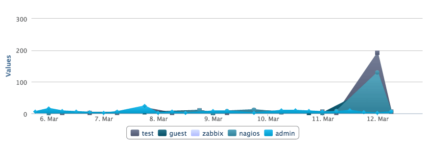 日志管理系统也可以让你以时间为做坐标轴的图表来查看,使你更容易发现异常。如果有人在几分钟内登录失败一次或两次,它可能是一个真正的用户而忘记了密码。但是,如果有几百个失败的登录并且使用的都是不同的用户名,它更可能是在试图攻击系统。在这里,你可以看到在3月12日,有人试图登录 Nagios 几百次。这显然不是一个合法的系统用户。