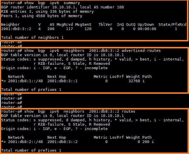 router-a# conf t router-a(config)# router bgp 100 router-a(config-router)# no auto-summary router-a(config-router)# no synchronization router-a(config-router)# neighbor 2001:DB8:3::2 remote-as 200