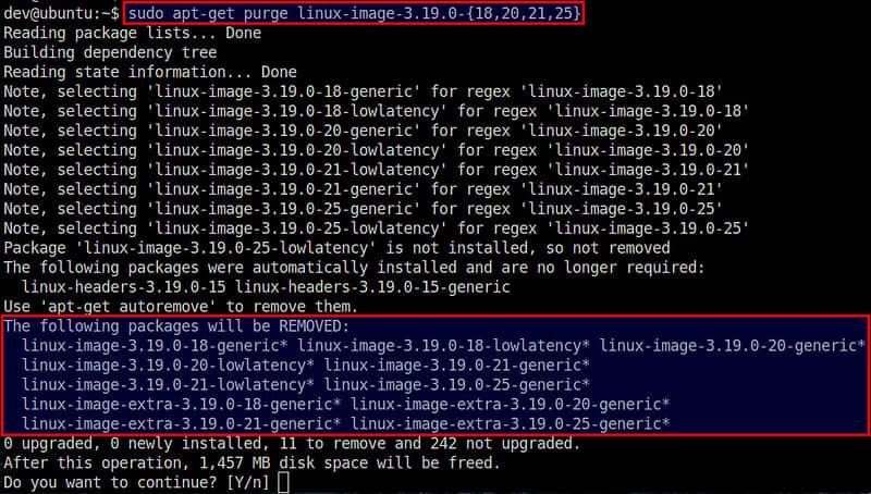 $ sudo apt-get purge linux-image-3.19.0-{18,20,21,25} $ sudo apt-get purge linux-headers-3.19.0-{18,20,21,25}
