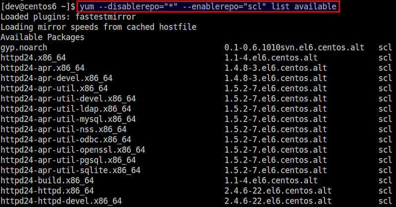 $ yum --disablerepo="*" --enablerepo="scl" list available