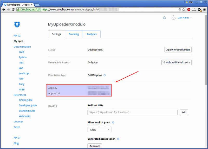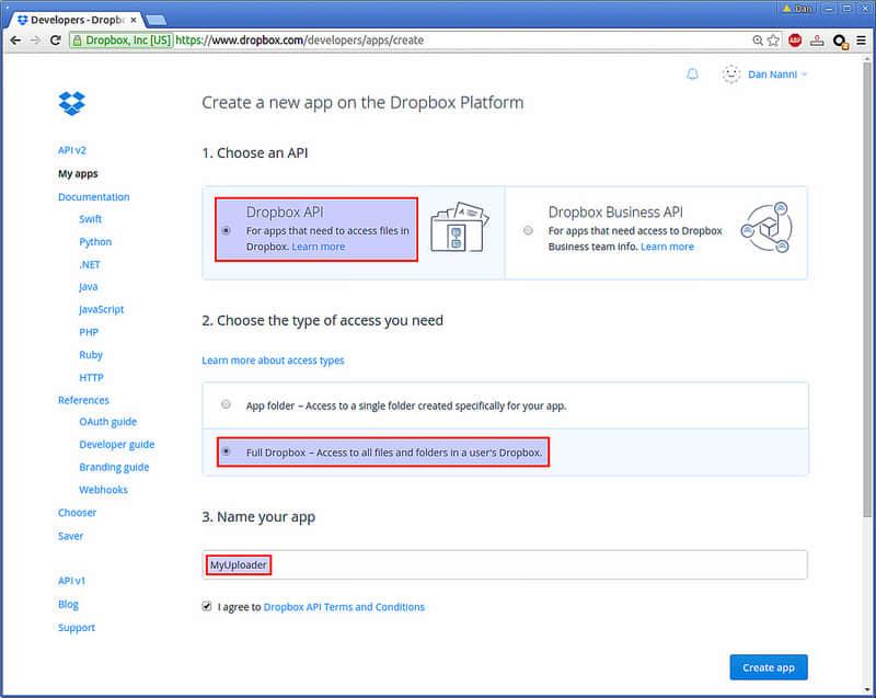 如上图所指示的那样,你需要通过浏览器访问 https://www.dropbox.com/developers/apps 页面,并创建一个新的 Dropbox app。接着像下图那样填入新 app 的相关信息,并输入 app 的名称,它与 Dropbox Uploader 所生成的 app 名称类似。