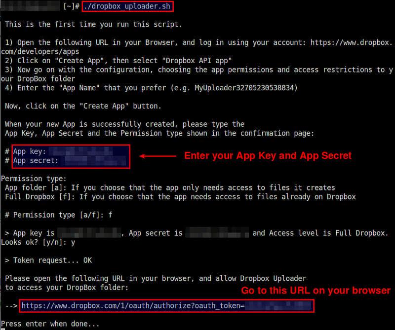 然后在正运行着 dropboxuploader.sh 的终端窗口中输入 app key 和 app secret。然后 dropboxuploader.sh 将产生一个 oAUTH 网址(例如,https://www.dropbox.com/1/oauth/authorize?oauth_token=XXXXXXXXXXXX)。%E3%80%82)