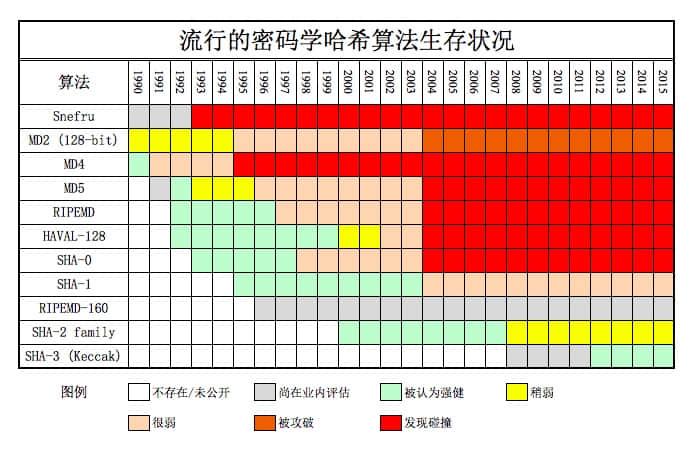从上图可以看到,SHA-2 之前的算法,除了 RIPEMD-160 外,都已经被攻破或存在可实现的碰撞算法了,因此,再将其应用到产品中,就存在了各种风险。所以,尽快升级你的加密策略吧。