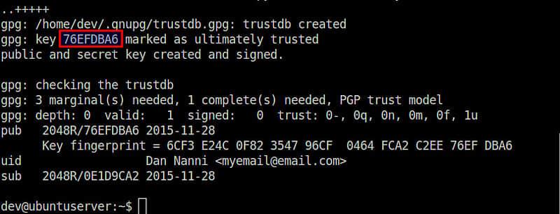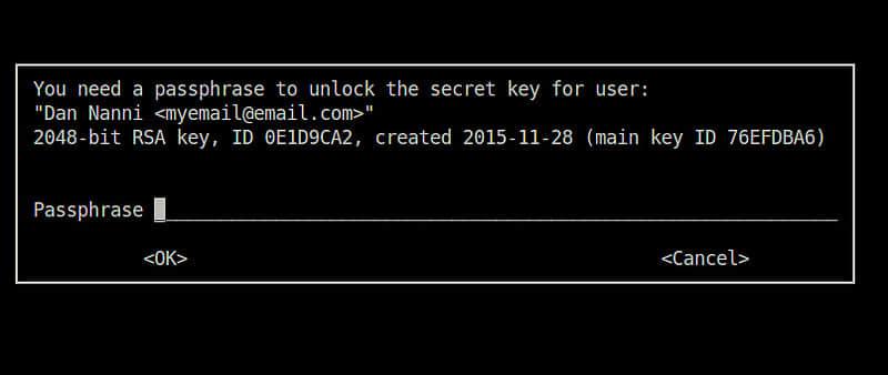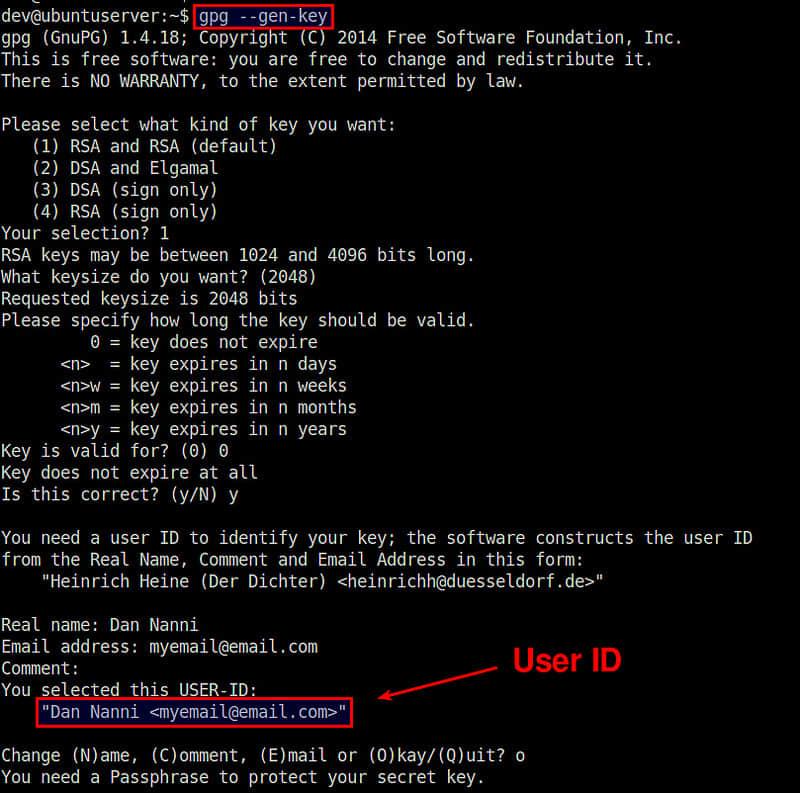 选择密钥类型(RSA),密钥长度(2048 bits),和过期时间(0 代表不过期)。当出现用户 ID 提示时,输入关联到该公钥/私钥对的名字(Dan Nanni) 和邮箱地址(myemail@email.com)。最后,输入一个密码来保护你的私钥。