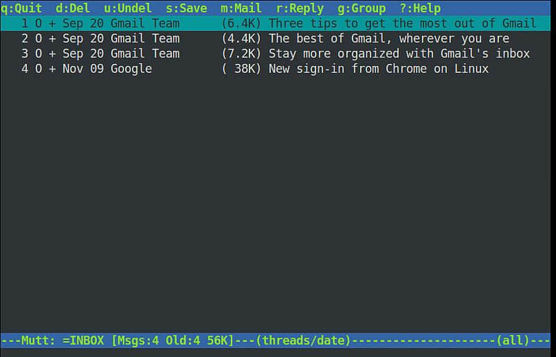 Mutt 是一个 Linux/UNIX 终端环境下的开源的邮件客户端。Mutt 以及 Alpine 在 Linux 命令行爱好者中有着最忠诚的追随者,这不是没有原因的。想一下你所期待邮件客户端应有的功能,Mutt 拥有:多协议支持(例如,POP3、IMAP 和 SMTP),S/MIME 和 PGP/GPG 集成,会话线索,颜色标记,可定制宏/快捷键,等等。另外,基于命令行的 Mutt 相比粗重的基于浏览器的邮件客户端(如:Gmail,Ymail)或图形用户界面的邮件客户端(如:Thunderbird,MS Outlook)而言,是一个使用电子邮件的轻量级替代品。