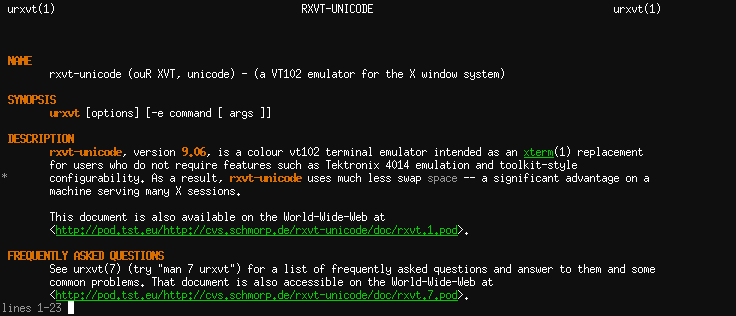 对于 Xterm/Urxvt,改变终端的前景/背景/粗体/下划线/斜体的颜色,可以让 less 显示更好的高亮效果。而 less 被用在 man 页面显示中,所以你会发现你的 man 显示更漂亮了。配置文件在此。
