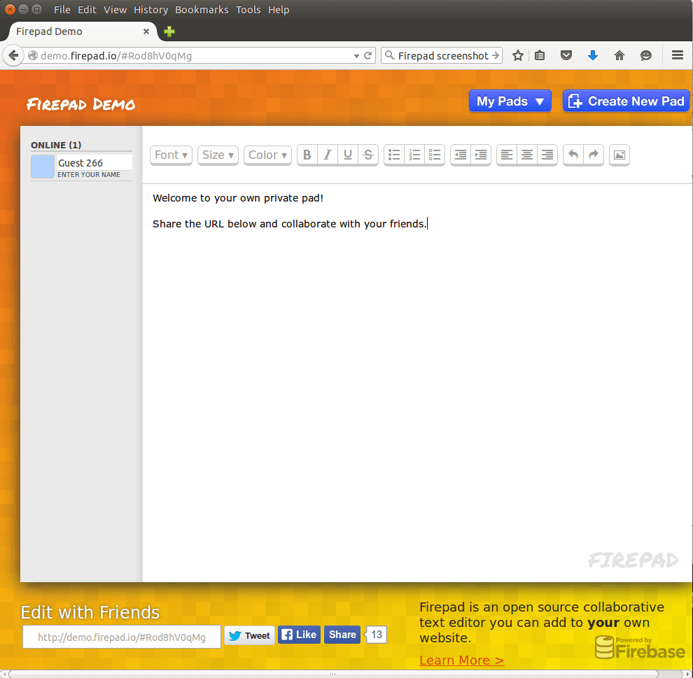 如果你想要通过添加简单的文档和代码编辑器来扩展你的网页应用能力,Firepad 最适合不过了。