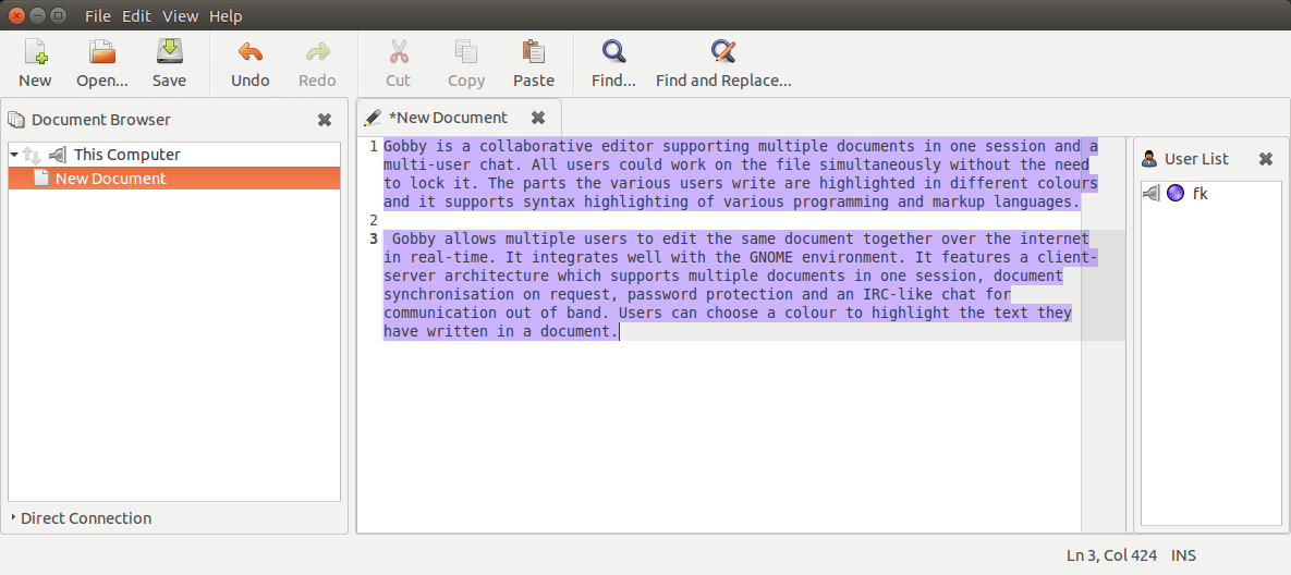 Gobby 允许多个用户在互联网上实时共同编辑同一个文档。它很好的整合了 GNOME 环境。它拥有一个客户端-服务端结构,这让它能支持一个会话开多个文档,文档同步请求,密码保护和 IRC 式的聊天方式可以在多个频道进行交流。用户可以选择一个颜色对他们在文档中编写的文本进行高亮。