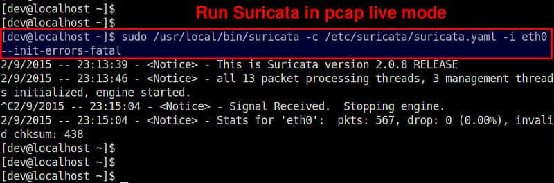 $ sudo /usr/local/bin/suricata -c /etc/suricata/suricata.yaml -i eth0 --init-errors-fatal