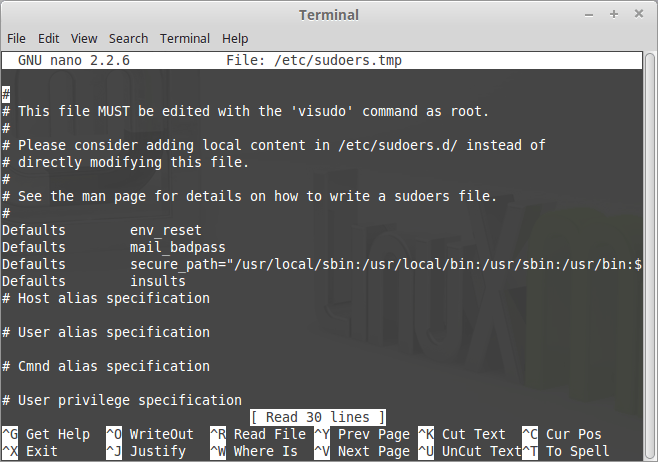 回到编辑 sudeors 文件界面,你需要找出 Defaults 所在的行。简单的很,只需要在文件的开头加上Defaults insults,就像这样: