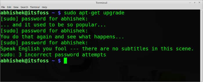 对我讲的感到疑惑?这里,让我们看下这张 gif 来了解下 sudo 是如何在你输错密码之后“嘲讽”你的。