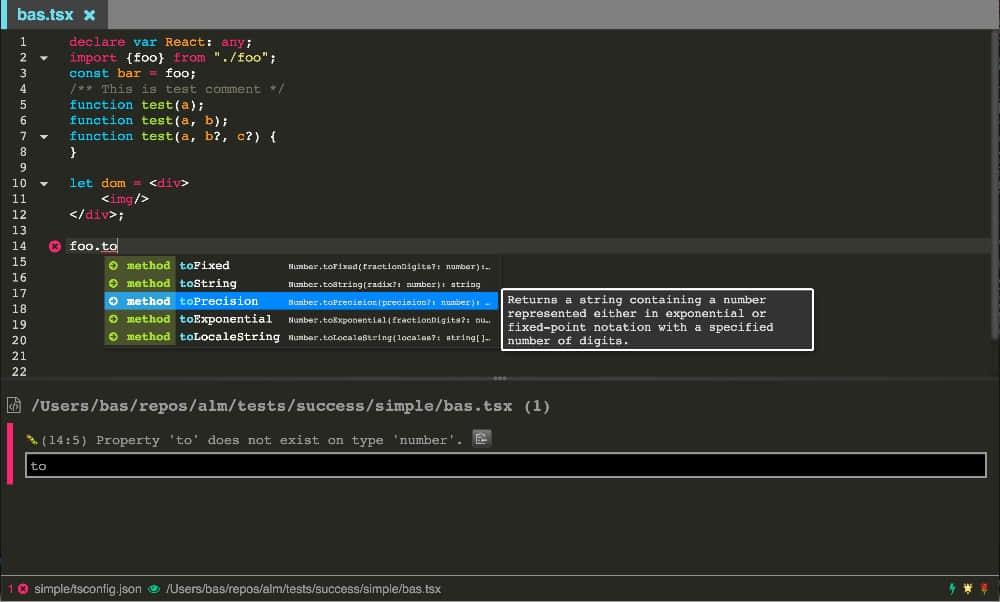 ALM 的开发者 Basarat Ali Syed 给这个 IDE 中打包了很多功能,包括为 TypeScript 定制的格式高亮方案,支持选项卡、多面板、go-to 跳转功能、查找替换功能、实时文件格式化和实时项目格式化。