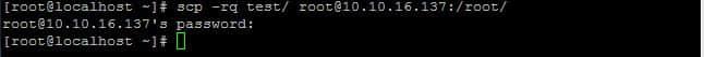 [root@localhost ~]# scp root@10.10.16.137:/root/importantfile /home/admin/ The authenticity of host '10.10.16.137 (10.10.16.137)' can't be established. RSA key fingerprint is b0:b0:a3:c3:2e:94:13:0c:29:2e:ba:0b:d3:d6:12:8f. Are you sure you want to continue connecting (yes/no)? yes Warning: Permanently added '10.10.16.137' (RSA) to the list of known hosts. root@10.10.16.137's password: importantfile 100% 0 0.0KB/s 00:00 [root@localhost ~]#