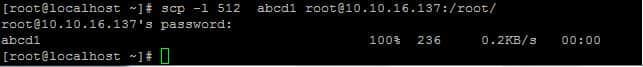 如下所示,我们可以使用 -l 参数来指定 scp 命令所使用的带宽,在此我们将速度限制为512kbit/s。