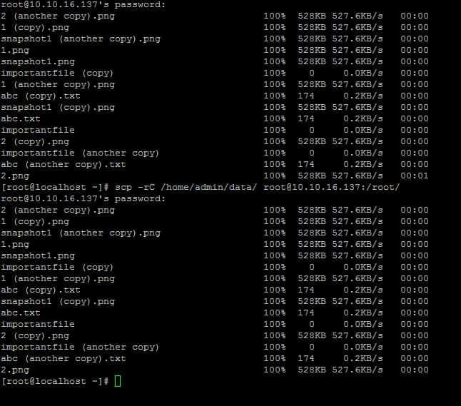 [root@localhost ~]# scp importantfile admin@10.0.0.6:/home/admin/ The authenticity of host '10.0.0.6 (10.0.0.6)' can't be established. RSA key fingerprint is SHA256:LqBzkeGa6K9BfWWKgcKlQoE0u+gjorX0lPLx5YftX1Y. RSA key fingerprint is MD5:ed:44:42:59:3e:dd:4c:12:43:4a:89:b1:5d:bd:9e:20. Are you sure you want to continue connecting (yes/no)? yes Warning: Permanently added '10.0.0.6' (RSA) to the list of known hosts. admin@10.0.0.6's password: importantfile 100% 0 0.0KB/s 00:00 [root@localhost ~]#