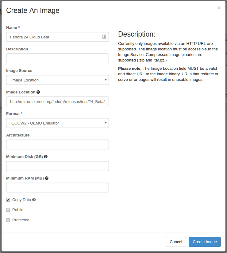 - Image Location: http://mirrors.kernel.org/fedora/releases/test/24_Beta/CloudImages/x86_64/images/Fedora-Cloud-Base-24_Beta-1.6.x86_64.qcow2