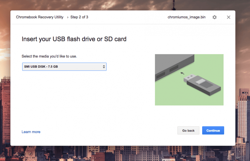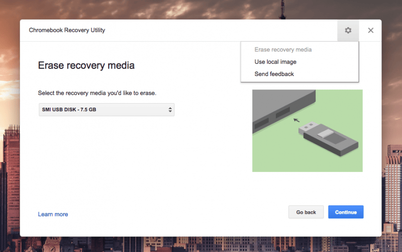 解压下载的 zip 文件,你会得到一个 chromiumos_image.bin 文件。现在插入 U 盘并打开 Chromebook Recovery Utility。点击工具右上角的齿轮,选择 erase recovery media(擦除恢复媒介,如图 1)。