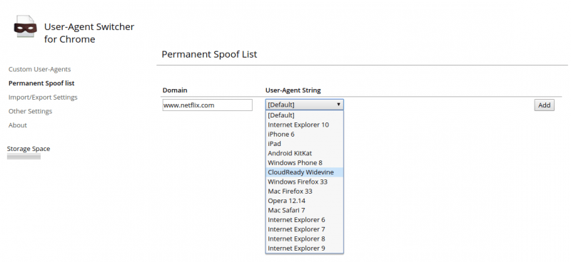然后,到“permanent spoof list(永久欺骗列表)”选项中将 CloudReady Widevine 添加为 www.netflix.com 的永久 UA 串。