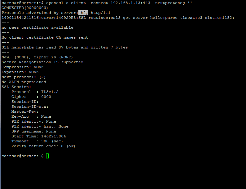 $ openssl s_client -connect localhost:443 -nextprotoneg ''