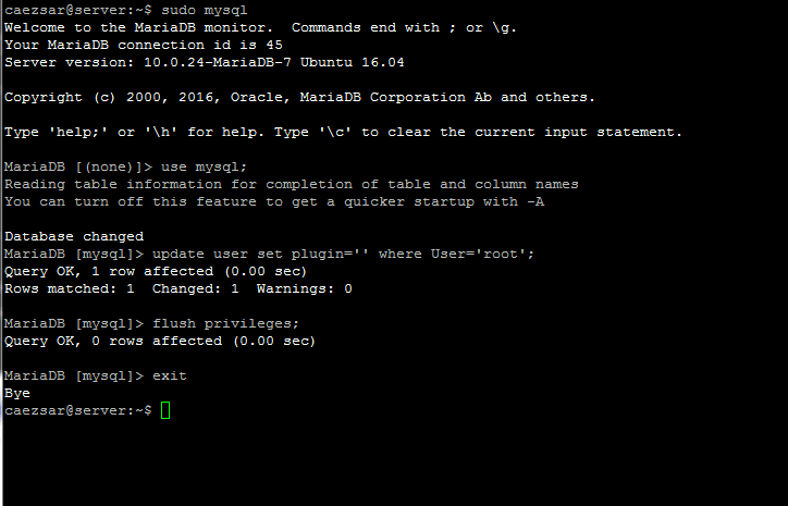 $ sudo mysql MariaDB> use mysql; MariaDB> update user set plugin=’‘ where User=’root’; MariaDB> flush privileges; MariaDB> exit