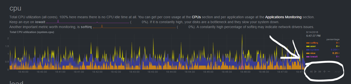 它的 web 前端响应很快,而且不需要 Flash 插件。 UI 很整洁,保持着 Netdata 应有的特性。第一眼看上去,你能够看到很多图表,幸运的是绝大多数常用的图表数据(像 CPU,RAM,网络和硬盘)都在顶部。如果你想深入了解图形化数据,你只需要下滑滚动条,或者点击在右边菜单的项目。通过每个图表的右下方的按钮, Netdata 还能让你控制图表的显示,重置,缩放。