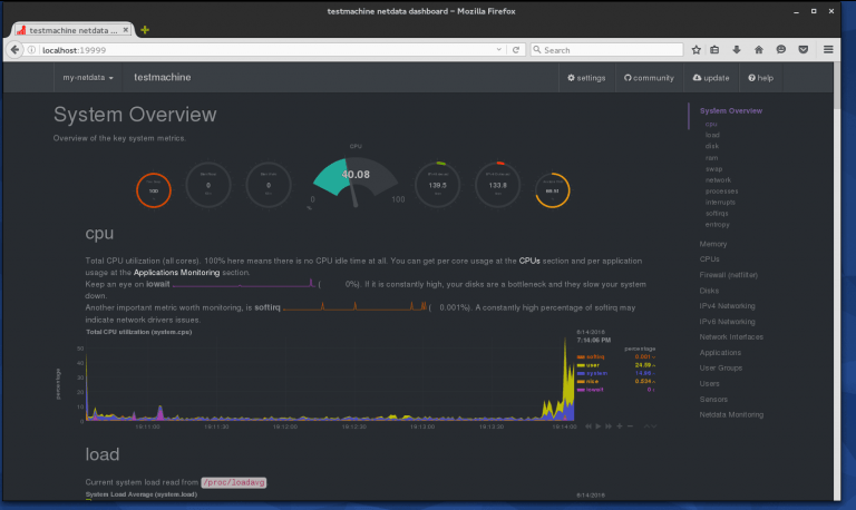 既然我们已经安装并且运行了 Netdata,你就能够通过 19999 端口来访问 web 界面。下面的截图是我在一个测试机器上运行的 Netdata。