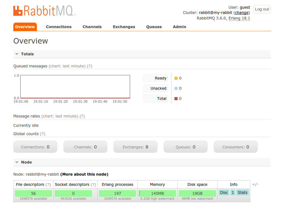 在浏览器中访问 http://localhost:15672 ,如果能够使用 guest:guest 验证信息登录 RabbitMQ 的控制面板,说明它已经在你的开发环境中运行起来了。