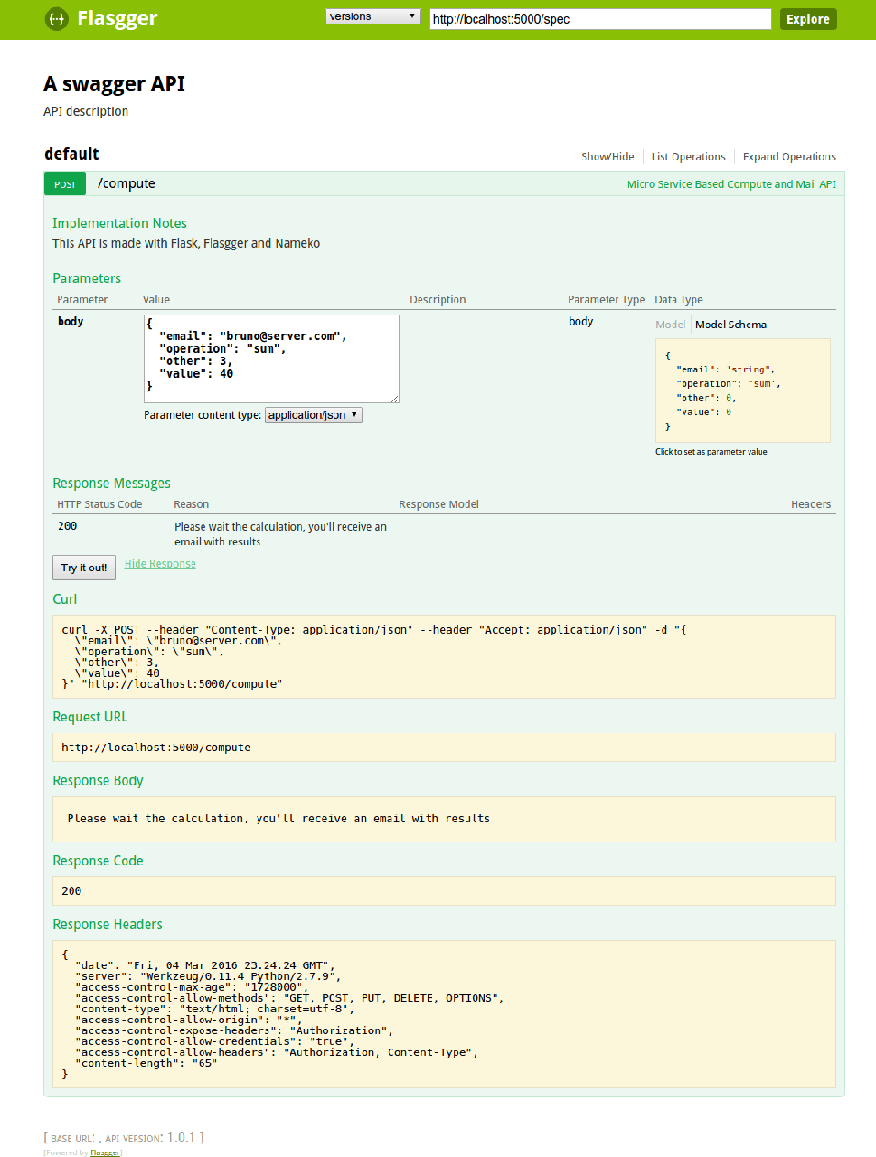 from flask import Flask, request from flasgger import Swagger from nameko.standalone.rpc import ClusterRpcProxy app = Flask(__name__) Swagger(app) CONFIG = {'AMQP_URI': "amqp://guest:guest@localhost"} @app.route('/compute', methods=['POST']) def compute(): """ Micro Service Based Compute and Mail API This API is made with Flask, Flasgger and Nameko --- parameters: - name: body in: body required: true schema: id: data properties: operation: type: string enum: - sum - mul - sub - div email: type: string value: type: integer other: type: integer responses: 200: description: Please wait the calculation, you'll receive an email with results """ operation = request.json.get('operation') value = request.json.get('value') other = request.json.get('other') email = request.json.get('email') msg = "Please wait the calculation, you'll receive an email with results" subject = "API Notification" with ClusterRpcProxy(CONFIG) as rpc: # asynchronously spawning and email notification rpc.mail.send.async(email, subject, msg) # asynchronously spawning the compute task result = rpc.compute.compute.async(operation, value, other, email) return msg, 200 app.run(debug=True)
