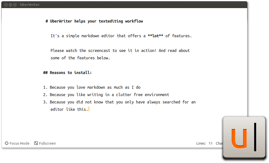 UberWriter 是一个简单、易用的 Linux Markdown 编辑器。它的开发受 Mac OS X 上的 iA writer 影响很大,同样它也具备这些卓越的特性: