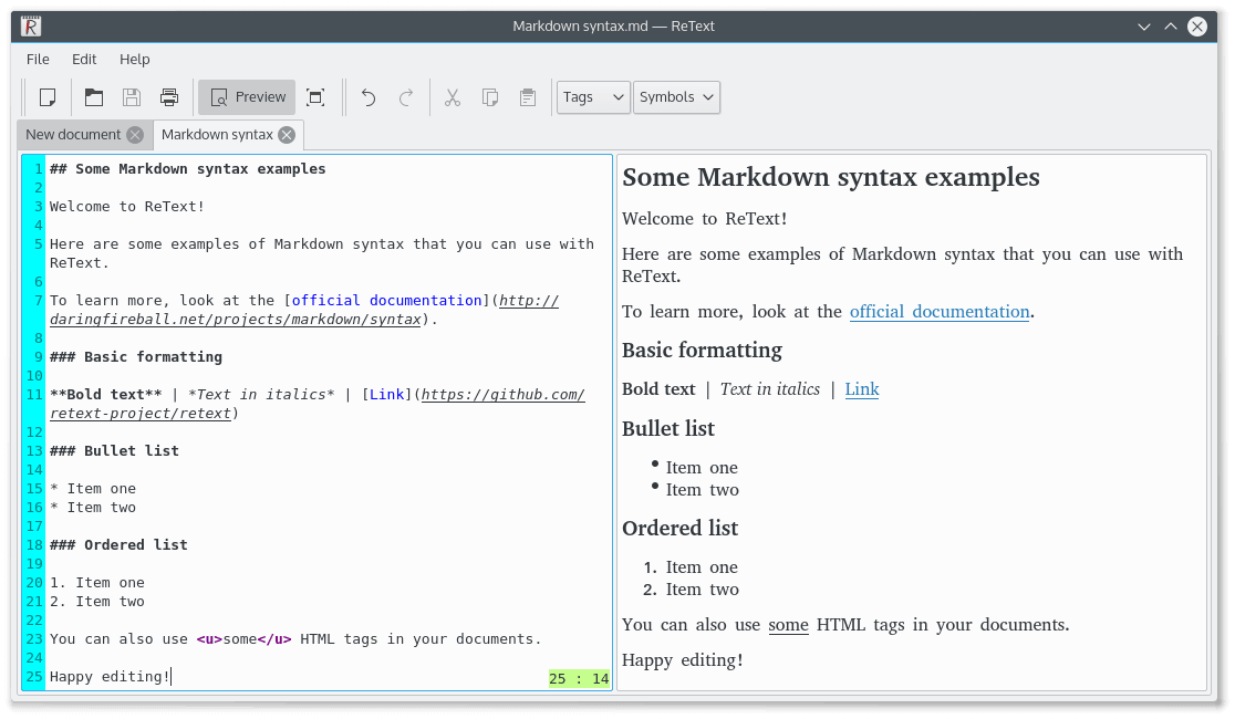 ReText 是为 Linux 和其它几个 POSIX 兼容操作系统提供的简单、轻量、强大的 Markdown 编辑器。它还可以作为一个 reStructuredText 编辑器,并且具有以下的特性: