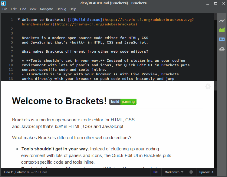 它也是通过插件高度可扩展的,你可以使用 Bracket-MarkdownPreview 插件来编写和预览 Markdown 文档。
