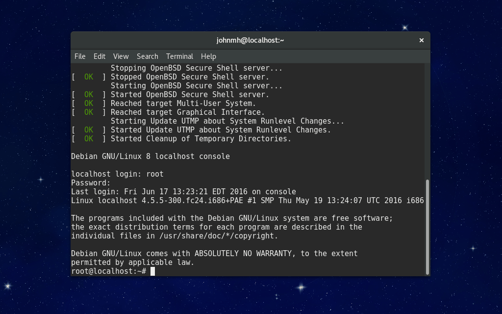 一旦你创建完目录,你需要运行 debootstrap,你可以从 Fedora 仓库中安装它。对于 Debian Jessie,你运行下面的命令来初始化一个 Debian 文件系统。