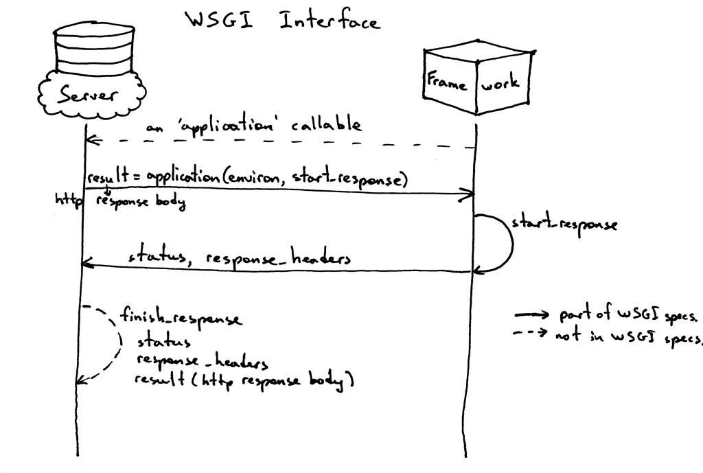 applition。它会向该对象传递一个包含 WSGI/CGI 变量的环境变量字典environ,以及一个可调用对象start_response。 - Web 框架或应用生成 HTTP 状态码和 HTTP 响应头部,然后将它传给
