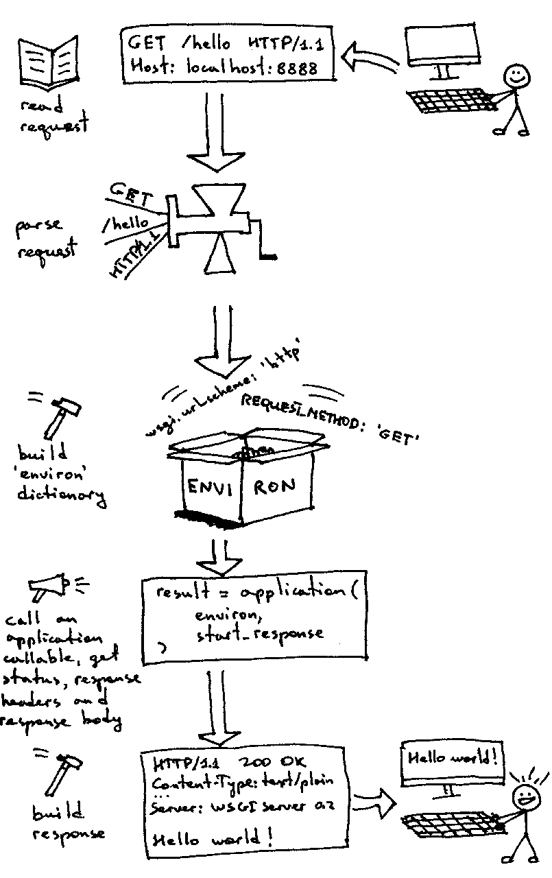 现在,你已经创造了属于你自己的 WSGI Web 服务器,你也使用不同 Web 框架做了几个 Web 应用。而且,你在这个过程中也自己创造出了一个朴素的 Web 应用及框架。这个过程真是累人。现在我们来回顾一下,你的 WSGI Web 服务器在服务请求时,需要针对 WSGI 应用做些什么: