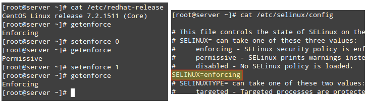 还有一点要注意,如果 getenforce 返回 Disabled,你得编辑 /etc/selinux/config 配置文件为你想要的操作模式并重启。否则你无法利用 setenforce 设置(或切换)操作模式。