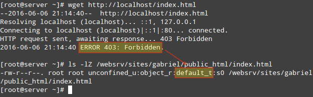 # wget http://localhost/index.html # ls -lZ /websrv/sites/gabriel/public_html/index.html