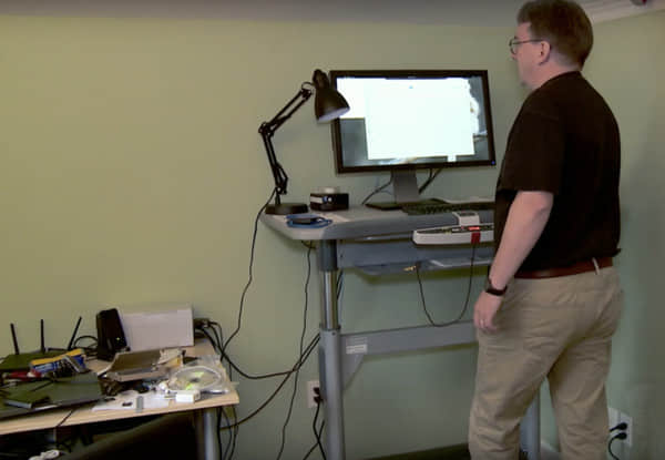 真相 5:尽管加起来有这么多的钱,还有那么多运行在 Linux 上的系统, 但是 Linus 仍然工作在家里,哦,还有他的猫在陪着他。下图是他在他的站立式工作桌前工作的照片: