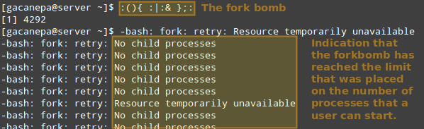然后,让我们来看看非 root 用户(合法用户或非法用户) 试图引起 shell fork 炸弹 (参见 WiKi) 时会发生什么。如果我们没有设置限制, shell fork 炸弹会无限制地启动函数的两个实例,然后无限循环地复制任意一个实例。最终导致你的系统卡死。