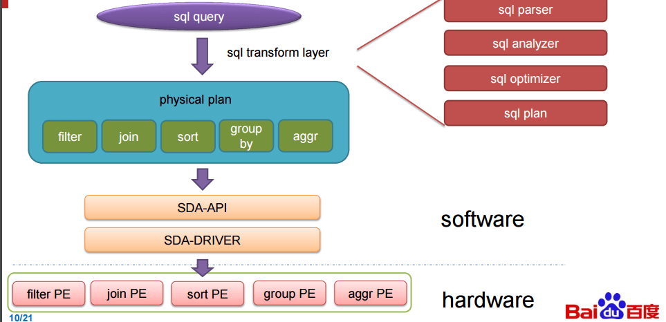 为了实现 SQL 查询加速,百度针对 TPC-DS 的基准测试进行了研究,并且创建了称做处理单元(PE)的特殊引擎,用于在基准测试中加速 5 个关键功能,这包括 筛选 , 排序 , 聚合 , 联合 和 分组 ,(我们并没有把这些单词都像 SQL 那样大写)。SDA 设备使用卸载模型,具有多个不同种类的处理单元的加速卡在 FPGA 中组成逻辑,SQL 功能的类型和每张卡的数量由特定的工作量决定。由于这些查询在百度的系统中执行,用来查询的数据被以列格式推送到加速卡中(这会使得查询非常快速),而且通过一个统一的 SDA API 和驱动程序,SQL 查询工作被分发到正确的处理单元而且 SQL 操作实现了加速。
