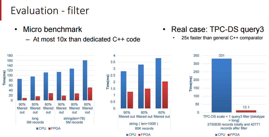 SDA 架构采用一种数据流模型,加速单元不支持的操作被退回到数据库系统然后在那里本地运行,比其他任何因素,百度开发的 SQL 加速卡的性能被 FPGA 卡的内存带宽所限制。加速卡跨整个集群机器工作,顺便提一下,但是数据和 SQL 操作如何分发到多个机器的准确原理没有被百度披露。