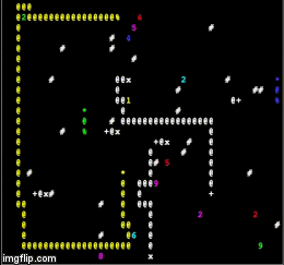 在渲染游戏的每个下一帧时也会产生数字和石头,它们是由随机值决定的。产生数字或者石头的概率可以在 settings.py 中修改成其它值。注意数字的产生是针对游戏区域每一个活的蛇的,所以蛇越多,产生的数字就越多,这样它们都有足够的食物来吃掉。