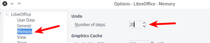 默认情况下,LibreOffice 允许你撤销一个文件的多达 100 个改变。绝大多数用户不需要这么多,所以在内存中保留这么多撤销步骤是对资源的巨大浪费。