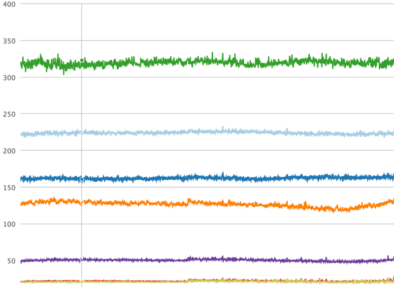 我们为此构建的工具叫做 Dynostats。Dynostats 利用 Django 中间件以一定的速率采样用户请求,记录关键的效率以及性能指标,例如 CPU 总指令数、端到端请求时延、花费在访问内存缓存(memcache)和数据库服务的时间等。另一方面,每个请求都有很多可用于聚合的 元数据 ,例如端点名称、HTTP 请求返回码、服务该请求的服务器名称以及请求中最新提交的 哈希值 。对于单个请求记录来说,有两个方面非常强大,因为我们可以在不同的维度上进行切割,那将帮助我们减少任何导致 CPU 回归的原因。例如,我们可以根据它们的端点名称聚合所有请求,正如下面的时间序列图所示,从图中可以清晰地看出在特定端点上是否发生了回归。