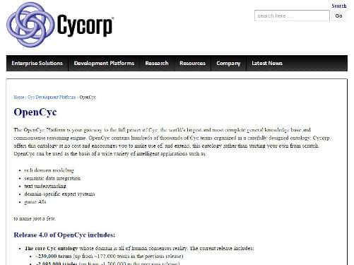 由 Cycorp 公司开发的 OpenCyc 提供了对 Cyc 知识库的访问和常识推理引擎。它拥有超过 239,000 个条目,大约 2,093,000 个三元组和大约 69,000 owl:这是一种类似于链接到外部语义库的命名空间。它在富领域模型、语义数据集成、文本理解、特殊领域的专家系统和游戏 AI 中有着良好的应用。该公司还提供另外两个版本的 Cyc:一个可免费的用于科研但是不开源,和一个提供给企业的但是需要付费。