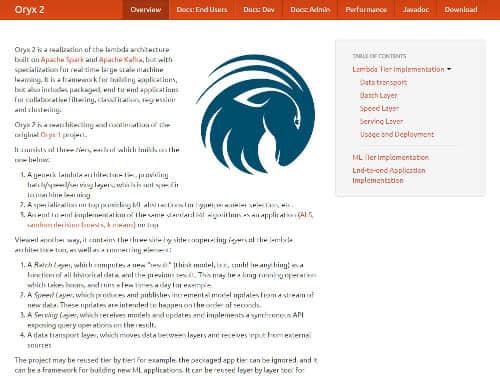 构建在 Apache Spark 和 Kafka 之上的 Oryx 2 是一个专门针对大规模机器学习的应用程序开发框架。它采用一个独特的三层 λ 架构。开发者可以使用 Orys 2 创建新的应用程序,另外它还拥有一些预先构建的应用程序可以用于常见的大数据任务比如协同过滤、分类、回归和聚类。大数据工具供应商 Cloudera 创造了最初的 Oryx 1 项目并且一直积极参与持续发展。