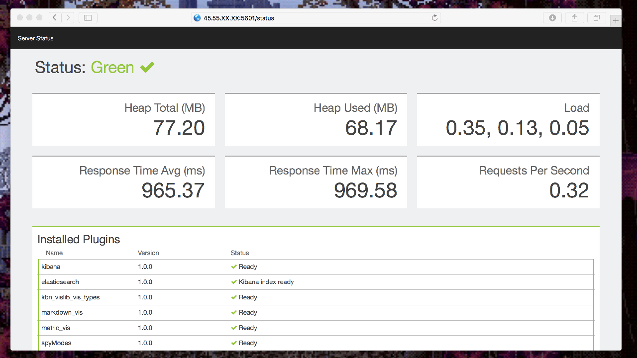 现在,通过 routing mesh 机制,我们可以使用浏览器访问服务器的 IP 地址来查看 Kibana 报表界面。