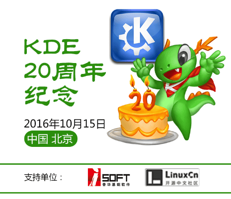 2016 年 10 月 15 日,由普华基础软件与“Linux 中国”开源社区共同联合主办的 KDE 20 周年庆祝沙龙在北京召开,欢迎各位 KDE 用户和开源爱好者们参加,沙龙不但由社区骨灰级爱好者进行讲演,而且还提供了琳琅满目的独有纪念品。报名人数名额限定,希望参加者需尽快报名。